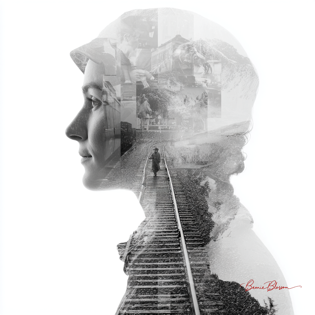 A profile portrait of a person, where their silhouette is filled with a detailed scene of a long train journey tracks stretching into the distance, passing landscapes, and small moments inside the train subtly visible within the form. The outer edges remain clean while the interior blends softly between portrait and scene, creating a layered, storytelling effect. Rendered in refined double exposure style with smooth transitions, balanced contrast, and a cohesive, cinematic atmosphere.