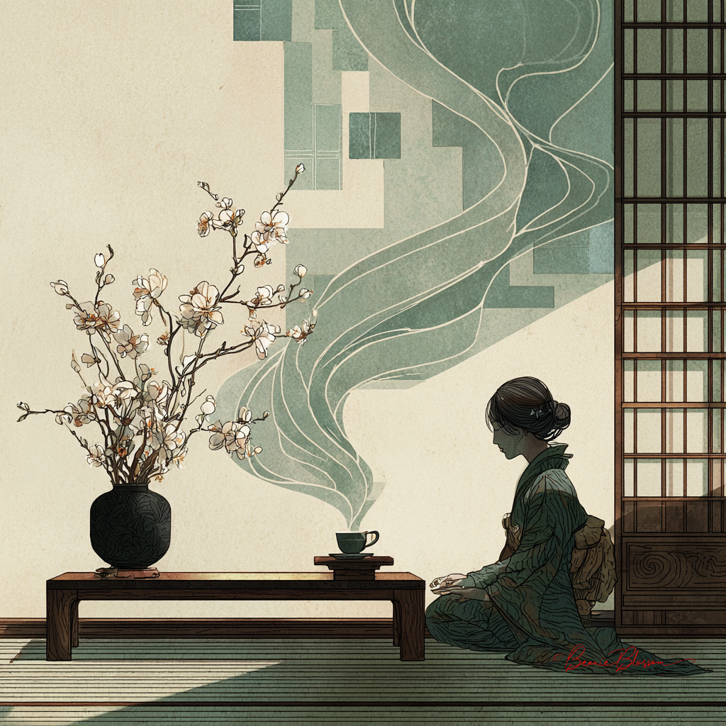 An intimate Art Nouveau-inspired pen and ink illustration of a solitary figure in a flowing silk kimono seated at a low wooden tea table in a minimalist Japanese interior, delicate steam rising from a ceramic teacup in spiraling patterns that transform into cherry blossom petals, soft afternoon light filtering through translucent shoji screens casting geometric shadows on tatami mats, a single ikebana arrangement of twisted branches and white orchids in an asymmetrical black ceramic vase, rendered with precise linework and subtle watercolor washes in muted greens, soft pinks, and warm grays.