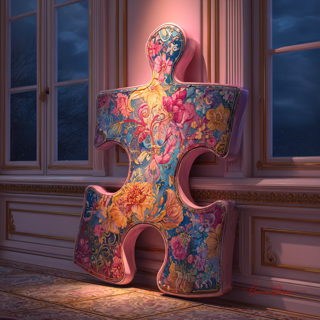 a large ornate puzzle piece is stuck in the wall of an old house, in the style digital art, concept design sheet, colorful, cartoon, cute, highly detailed, hyper-realistic, interior design, living room, bright colors, evening time, pink and orange color scheme, window light, full-body shot, side view.