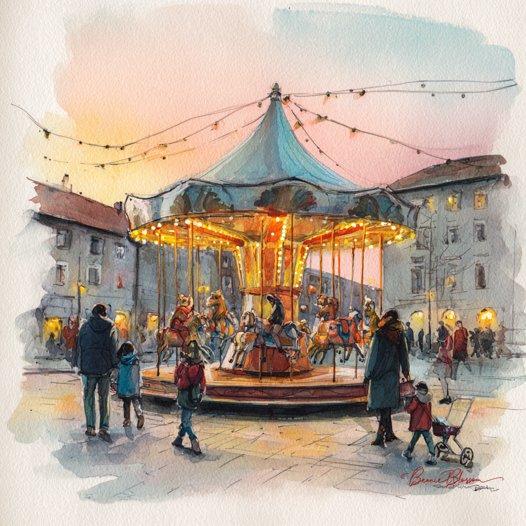 A small traveling carousel set up in a village square, painted horses mid-gallop beneath strings of warm lights. Children run around laughing, scarves fluttering in the breeze, while parents stand nearby as the sky turns soft pink at sunset. Rendered in watercolor style with fluid washes, gentle color bleeding, light line accents, and a luminous, airy atmosphere full of warmth and movement.