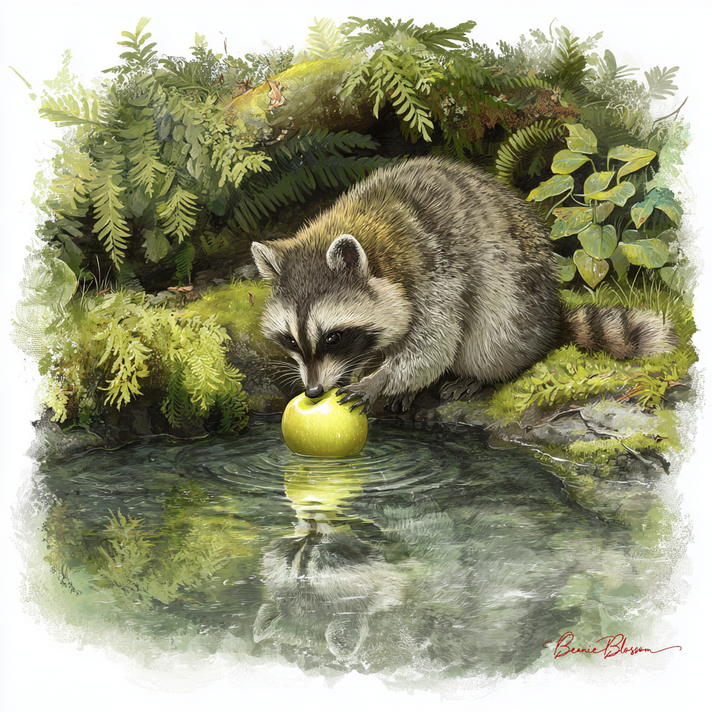 A raccoon carefully washing a shiny apple in the shallow edge of a forest stream, its reflection slightly distorted in the rippling water. Ferns and moss frame the scene. Rendered in soft illustration style with delicate textures, natural greens, and a sweet, tender mood.