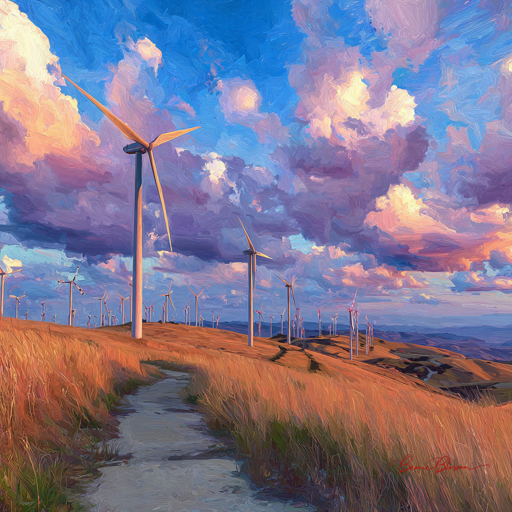 A hilltop covered in tall grass where dozens of colorful wind turbines spin slowly in the breeze, their blades catching shifting light from a dramatic sky. A narrow path winds through the field, hinting at scale and movement. Rendered in painterly style with smooth blending, layered sky tones, and a sense of open-air energy.