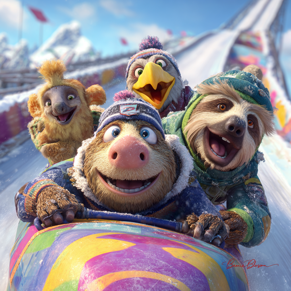 A determined team of tropical animals a monkey, a parrot, a sloth, and a capybara squeeze into a brightly colored bobsled at the top of a snowy Olympic track. They’re wearing mismatched winter gear over their tropical fur and feathers, looking nervous but excited. Rendered in cinematic family-film style with vibrant colors, dynamic motion, expressive faces, and a joyful, underdog-team spirit.