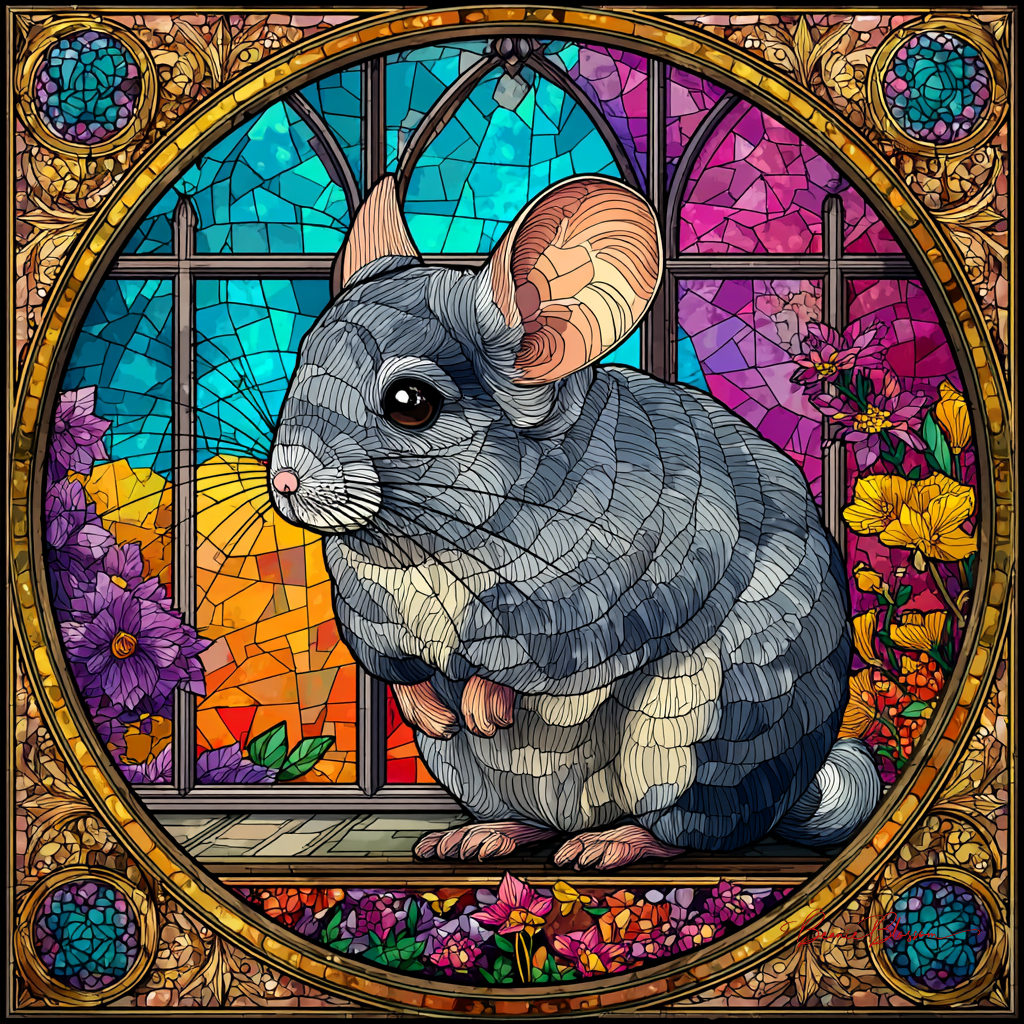 a stained glass illustration of an adorable chinchilla, in the style of a cottagecore aesthetic, featuring a full-body portrait surrounded by a large window with vibrant stained glass, set against a colorful background, highly detailed.