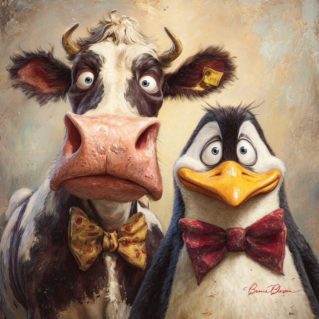 A whimsical caricature of a dapper cow and a slightly grumpy penguin wearing oversized bow ties, standing side by side as if posing for an absurdly formal portrait, exaggerated facial expressions, expressive eyes, subtle smirks, high-fashion attitude, vibrant color palette, painterly texture with bold brush strokes, soft studio lighting, clean but lively background, ultra-detailed, crisp focus, charming and humorous tone