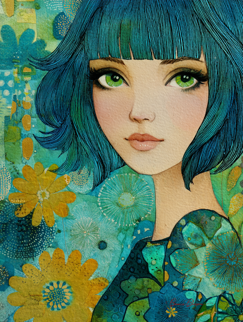 a girl with blue hair and bangs, wearing an outfit decorated in turquoise floral patterns. her eyes have striking green hues that stand out against her fair skin tone. the background is adorned with various shades of teal, complemented by yellow accents on the flowers, creating a whimsical atmosphere. this portrait captures intricate details, showcasing the unique style of mixed media art.