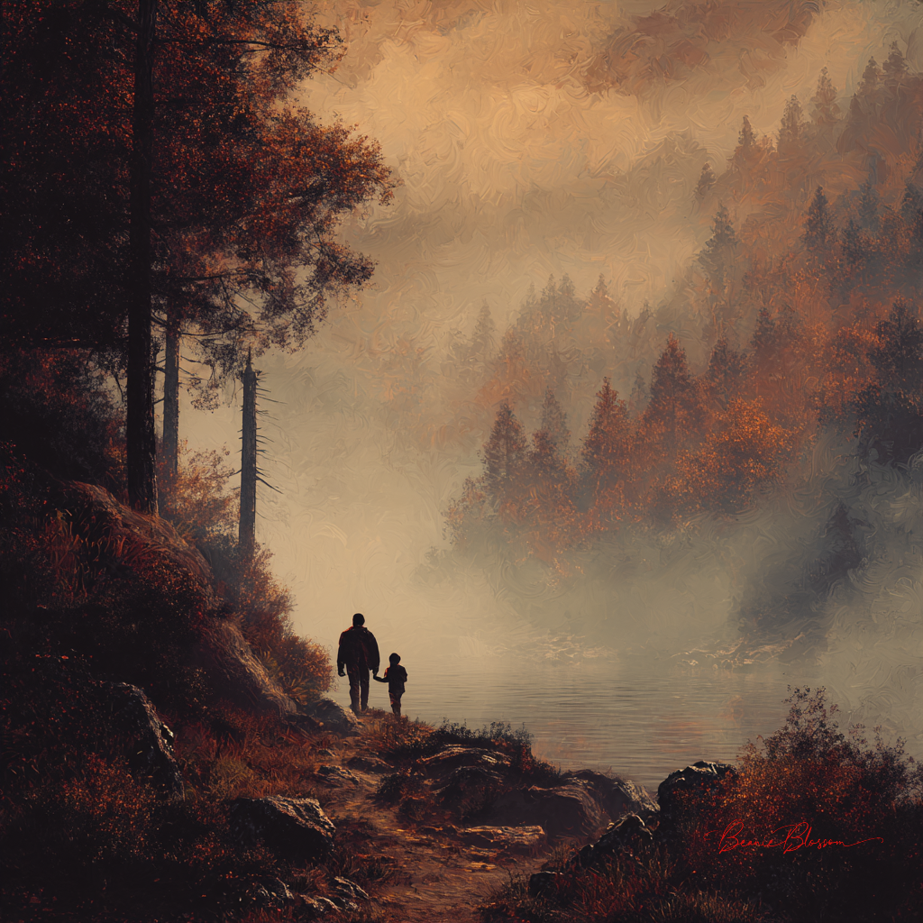 Create a stunning ethereal and dreamlike landscape with a father walking with his son. Make it look weathered and contemplative with rich amber undertones and deep shadowed textures in the style of digital oilpainting.