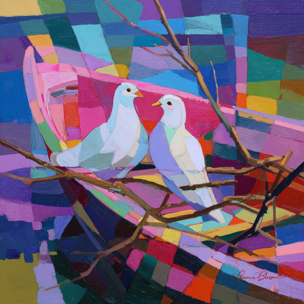 an abstract painting of two white doves, with vibrant colors. a pink boat with dry branches on it is in the background. the painting is in the cubist style and has a minimalistic approach, using oil paint.