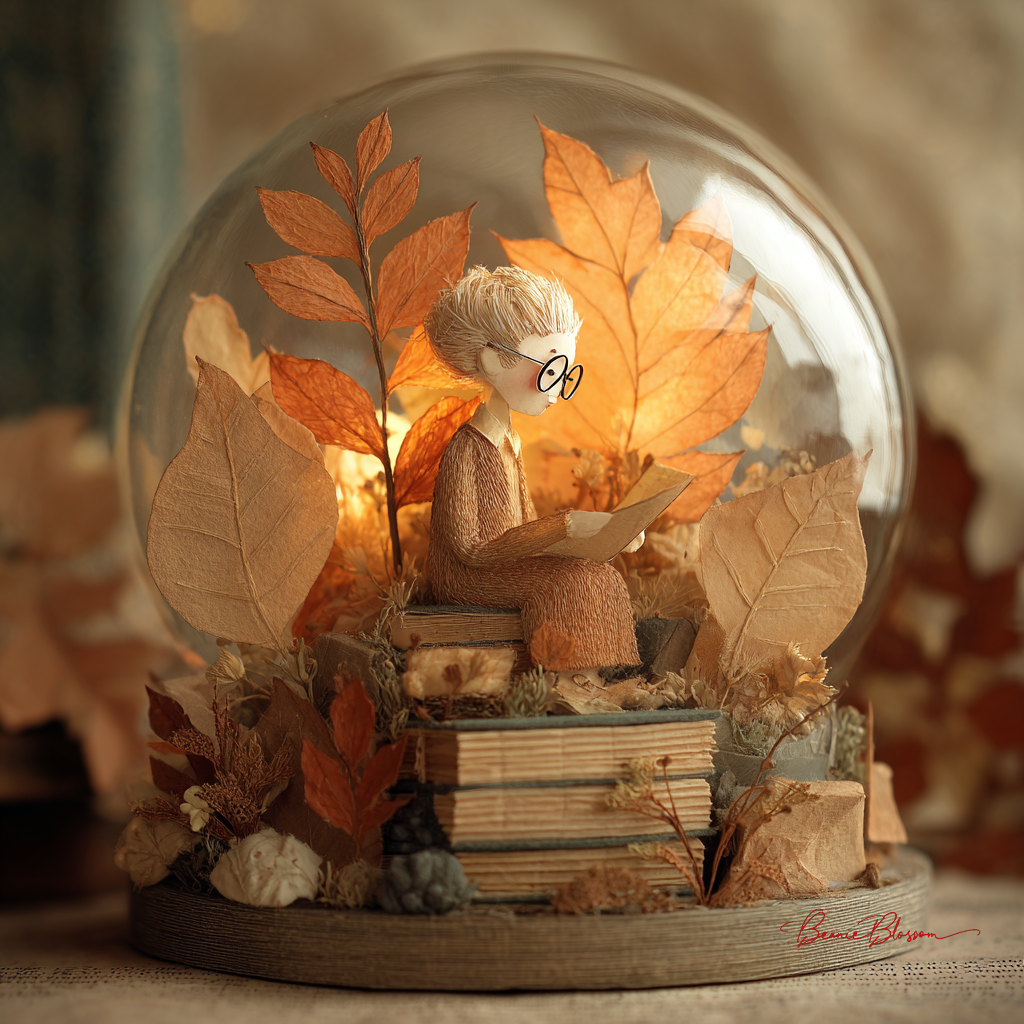 A tiny librarian figure made of pressed autumn leaves with small spectacles, cataloging clouds in a ledger while sitting inside a glass snow globe on a giant's desk. Vintage botanical illustration style with paper cut-out and embroidery details. Burnt umber, rust orange, and sage green tones with warm amber light filtering through translucent leaves. High detail, contemplative autumn atmosphere.