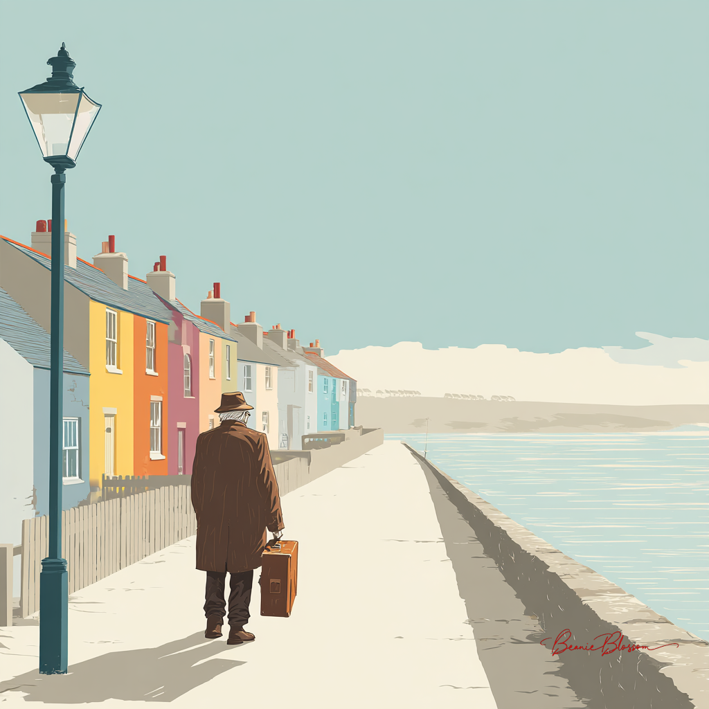 a vector illustration of an old man with his suitcase walking along the boardwalk in st ives, hayle bay, uk. The houses on one side have rainbow-colored roofs. there is a street lamp next to him, and the sea is behind it. the image has a white background.