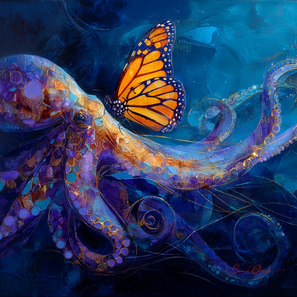 Contemporary fusion art of giant Pacific octopus and monarch butterfly in gravitational dance, bioluminescent photography blended with abstract expressionism, tentacles flowing like liquid light ribbons meeting delicate orange wings mid-flutter, mixed media combining oil paint texture with holographic iridescence, deep purples, electric blues, burnt orange and gold leaf, octopus dissolving into gestural brushstrokes while butterfly scales crystallize into mosaic fragments, underwater and sky merged into impossible weightless space, layers of transparency creating dimensional depth, vibrant energetic exploration of metamorphosis and transformation