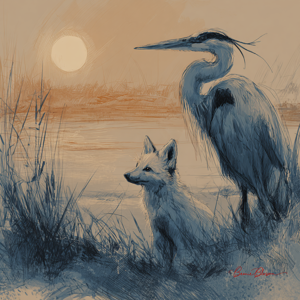 an artic fox and a blue heron during golden hour, Expressive Sketch Art