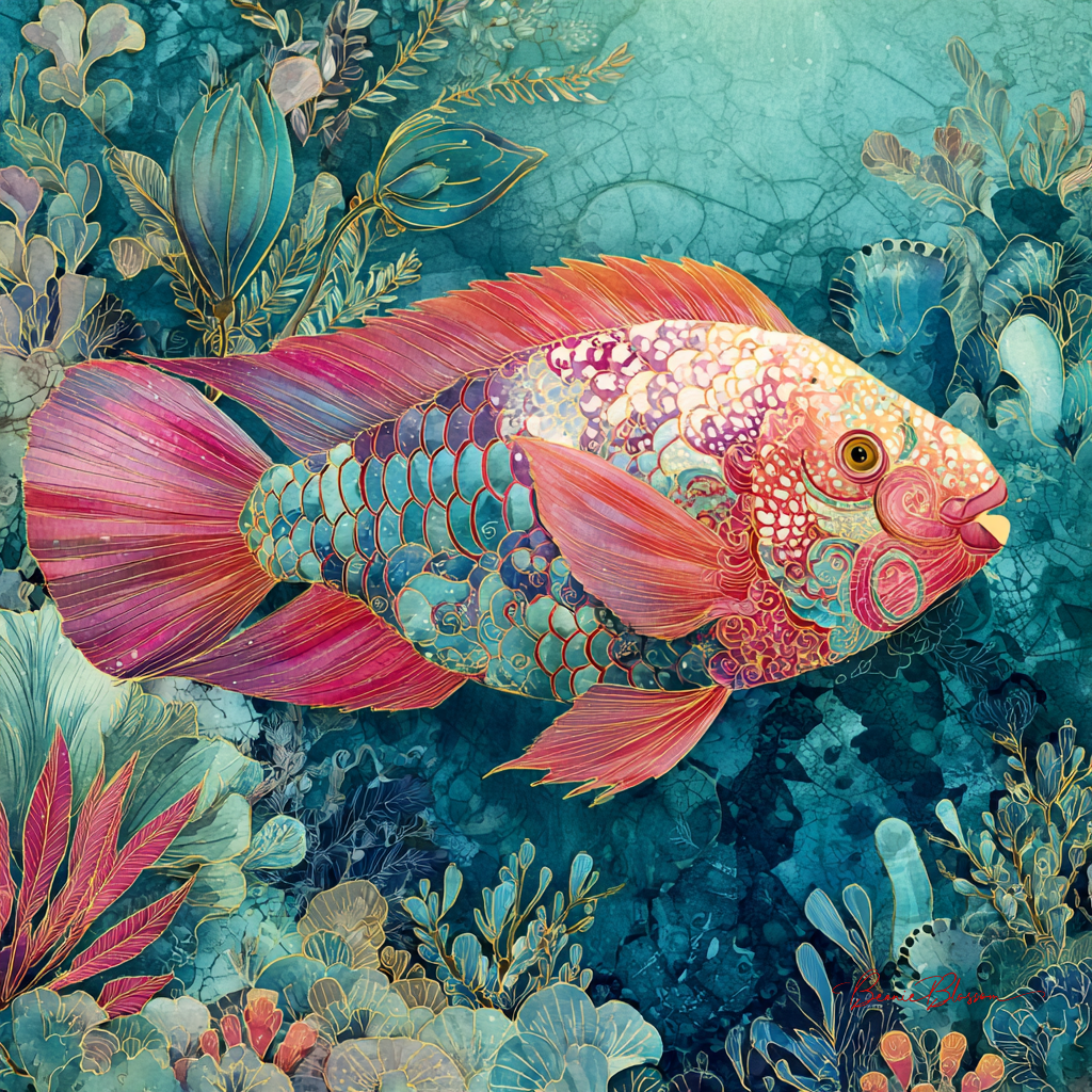 A vibrant parrot fish adorned with intricate, swirling patterns and shimmering scales, gliding gracefully through a maze of sunken pirate ship remains, in the mysterious depths of a coral-cloaked shipwreck in the Caribbean, watercolor with a touch of surrealism, vivid coral pinks, seafoam greens, and hints of ultramarine with dappled sunlight filtering through the water, a curious blend of tranquility and adventurous intrigue