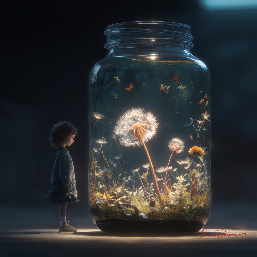 a little girl stands next to the jar, inside which there is an illustration of dandelions and small animals in it, in anime style, dark background, cinematic light, cartoon style, cute, hyper realistic, trending artstation, conceptart, soft lighting, high resolution, high detail, high contrast, high quality