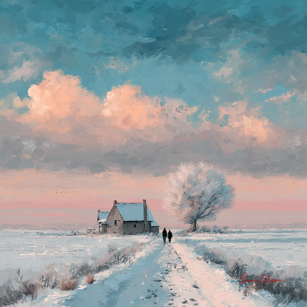 a beautiful winter landscape with white snow, an old house in the distance, and two people walking along the path to it. highly detailed digital painting in the style of artstation, with a soft color palette with a dash of pink