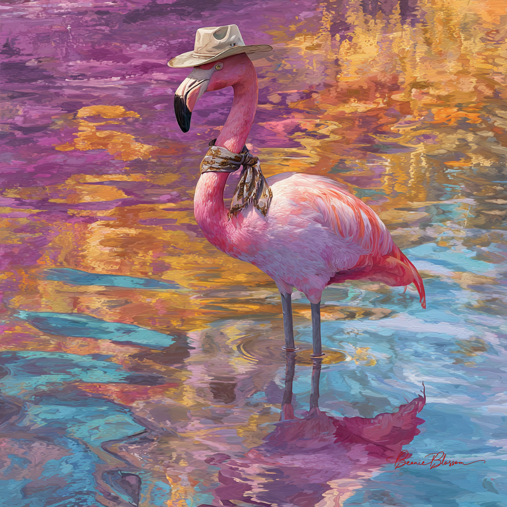 A whimsical flamingo wearing a hat and a scarf, standing knee-deep in a shallow, reflective lagoon, painting rippling strokes of color across the water