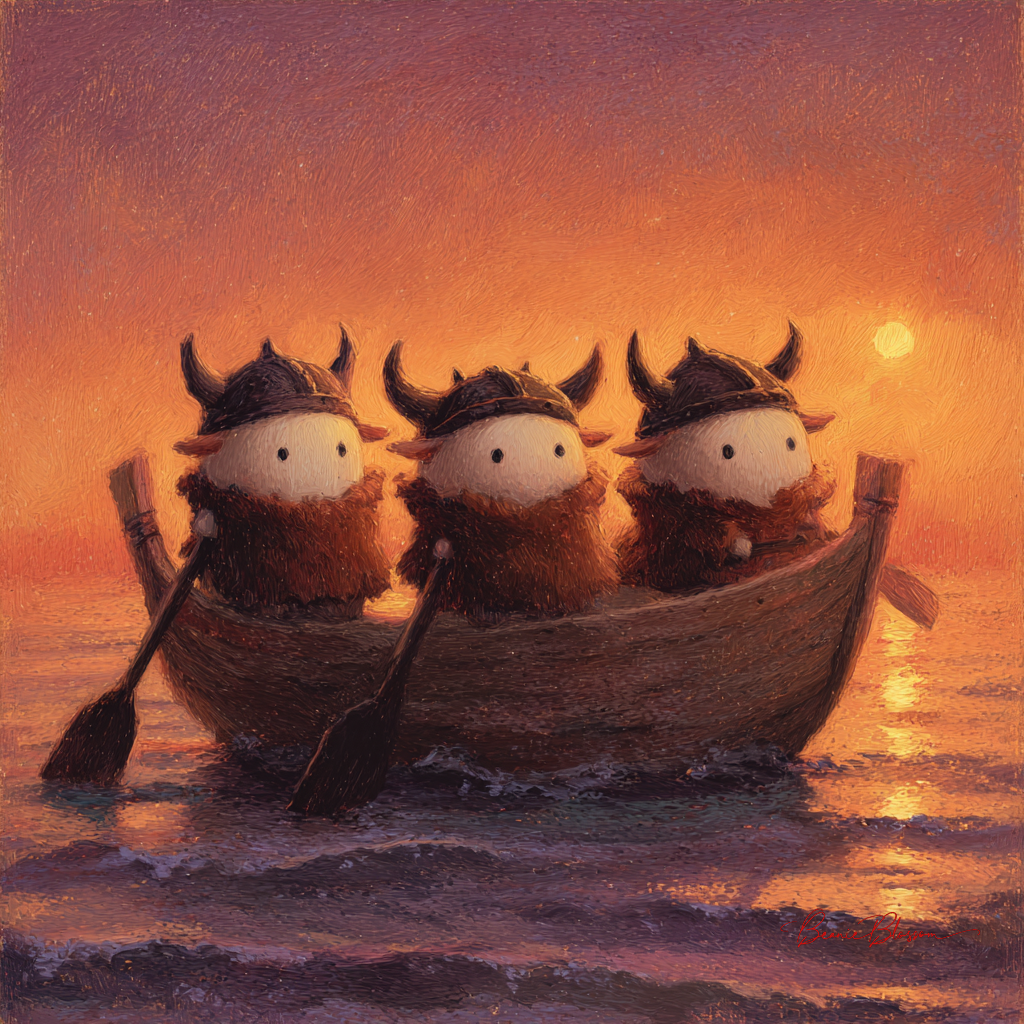 Three small, cute Viking creatures sailing together on a hand-carved wooden longboat, drifting calmly toward a glowing sunset. Their rounded forms and soft expressions give them a gentle, endearing presence--tiny horned helmets slightly oversized, fur-trimmed cloaks fluttering in the sea breeze. The scene is painted in a loose, expressive painterly style with visible brushstrokes and softened edges. The ocean is calm, reflecting warm hues of amber, coral, and muted gold, while the sky melts from deep rose into dusky violet near the horizon. Light wraps softly around the figures, emphasizing mood over detail, with subtle texture in the paint and a storybook, almost oil-on-canvas feel. Quietly adventurous, cozy, and hopeful, like a bedtime tale frozen at golden hour.