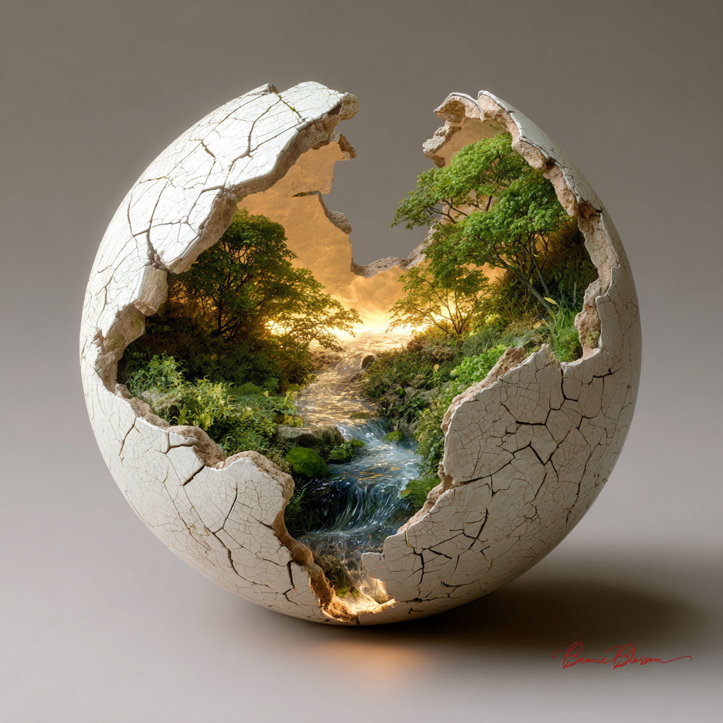 highly detailed ceramic sculpture scene of a cracked porcelain sphere resting on a neutral surface, the broken opening revealing a vivid miniature world inside--lush greenery, flowing water, and soft glowing light--glossy and matte contrasts, fine surface textures, subtle reflections, studio lighting, elegant composition, surreal but tactile, high-end art photography feel