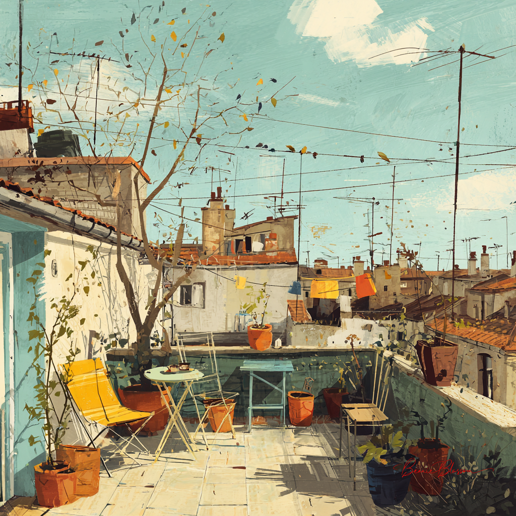 a wide view of a quiet rooftop garden in early spring, uneven tiles, scattered chairs, climbing plants reclaiming the space, laundry baskets, small tables with half-finished things, birds moving through the scene, soft breeze visible in fabric and leaves, bright late morning light, subtle brushstrokes, happy colors, lived-in and slightly imperfect, calm but full of small details