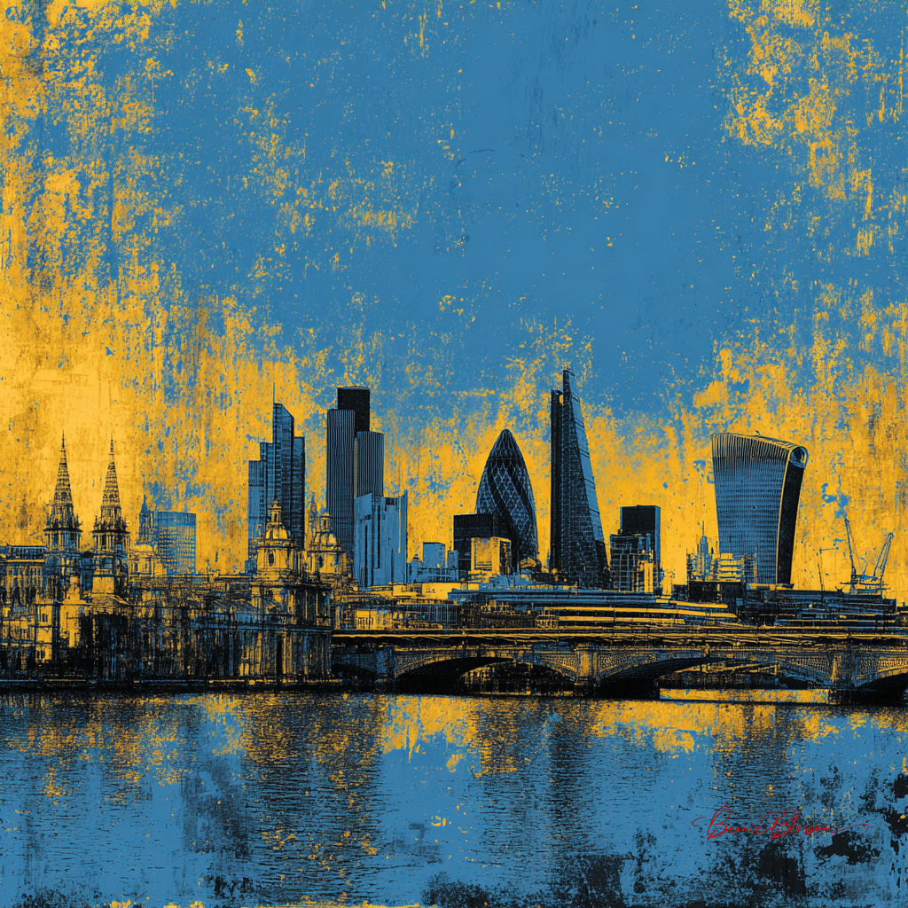 Naïve expressionist digital painting of London skyline on heavily distressed golden-blue background, rendered with bold irregular black outlines