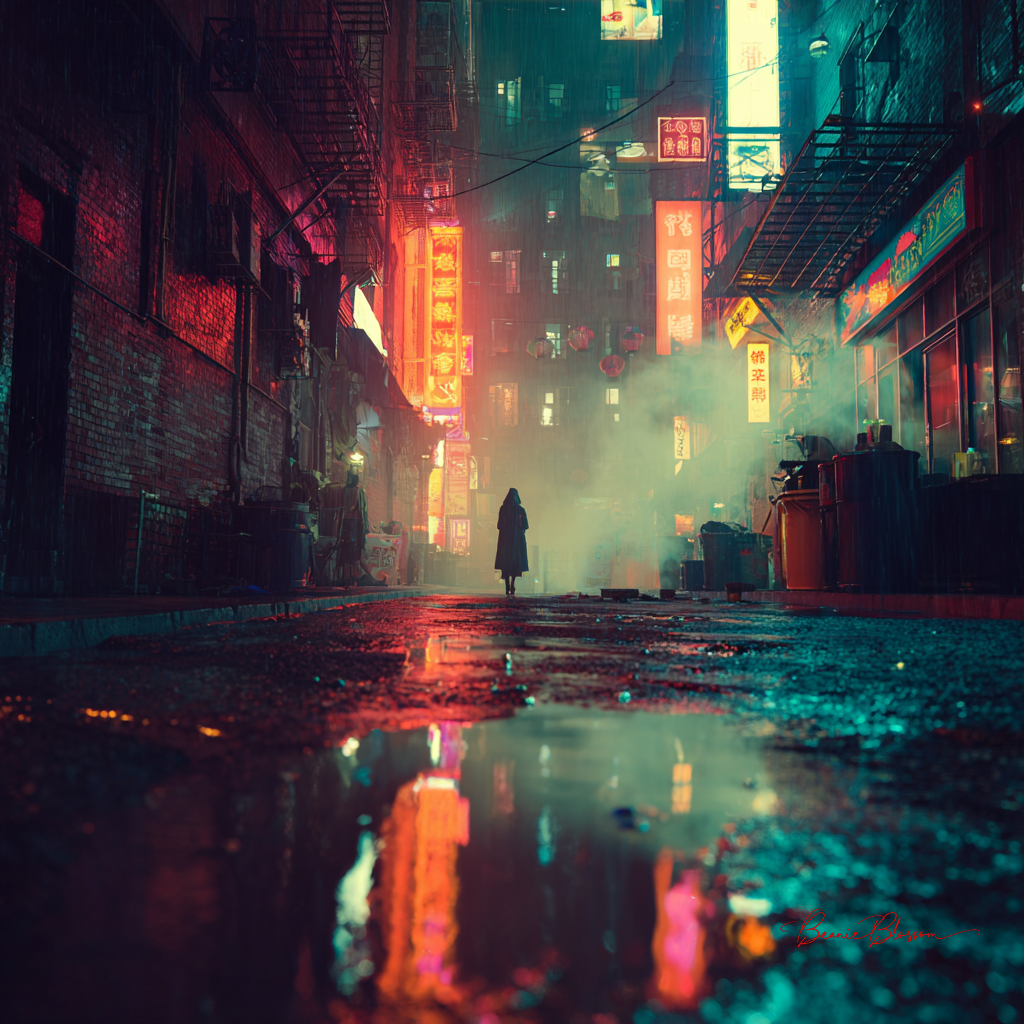 Neon-soaked back alley in a rain-drenched cyberpunk city, reflections of red and violet signage bleeding across wet asphalt, steam rising from grates, a lone figure in a hooded coat, cinematic noir atmosphere, hyper-detailed gritty textures, sharp contrast, tense and electric