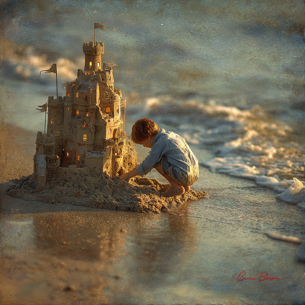 A child building a sandcastle, but the castle is impossibly intricate and alive--tiny windows glowing, miniature balconies, little flags moving in the sea breeze, subtle oil paint texture and diffused edges, gentle nostalgic mood, quiet shoreline with soft foam waves, warm late afternoon sunlight, close-up low angle placing the viewer at sand level, dreamy painterly illustration