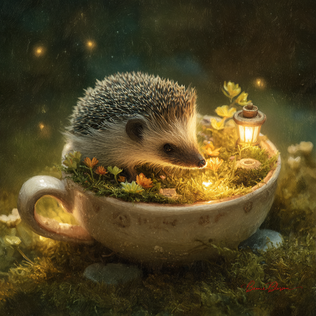 A tiny, round baby hedgehog carefully tending a miniature lantern-lit garden growing inside a hollow teacup, watering glowing flowers with a thimble, soft moss and tiny stepping stones filling the cup, warm golden evening light, fireflies drifting around, the hedgehog slightly too big for the cup creating a gentle sense of overflow, cozy and wholesome mood, subtle oil paint texture and diffused edges, soft depth of field, intimate close-to-mid view