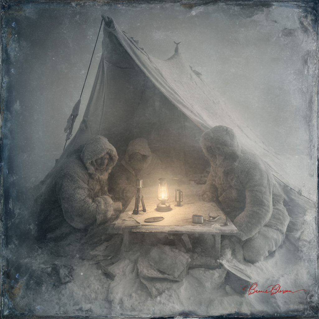 A ghostly daguerreotype-style image of a 19th-century Arctic expedition camp at the edge of total whiteout, three fur-clad figures hunched around a failing oil lamp inside a canvas tent that billows violently against unseen wind, their breath visible in frozen clouds, scattered across a makeshift table are sextants, hand-drawn maps weighted down by ice axes, and a half-eaten tin of rations, the entire scene rendered in cold silver-gray tones with deep vignetting at the corners, the lamp casting the only warm amber glow against an otherwise colorless world pressing in from all sides, a sense of vast isolation conveyed through the contrast between the cramped intimacy of the tent interior and the implied infinity of the blizzard beyond its thin walls