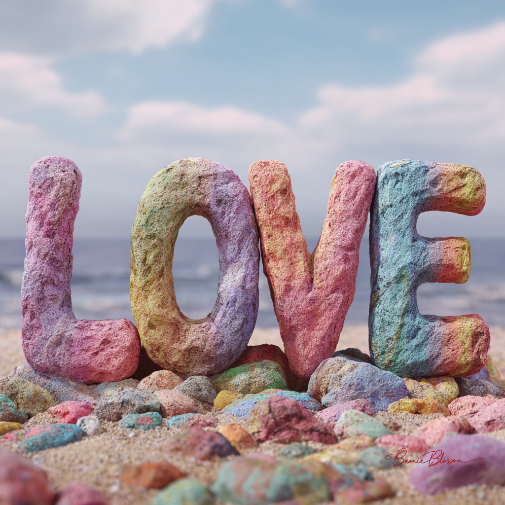 3d text "Love" made of colorful, chalk stone, a beachscape background. the image has no shadows, soft lighting, and pastel colors, creating a hyper-realistic photographic effect.