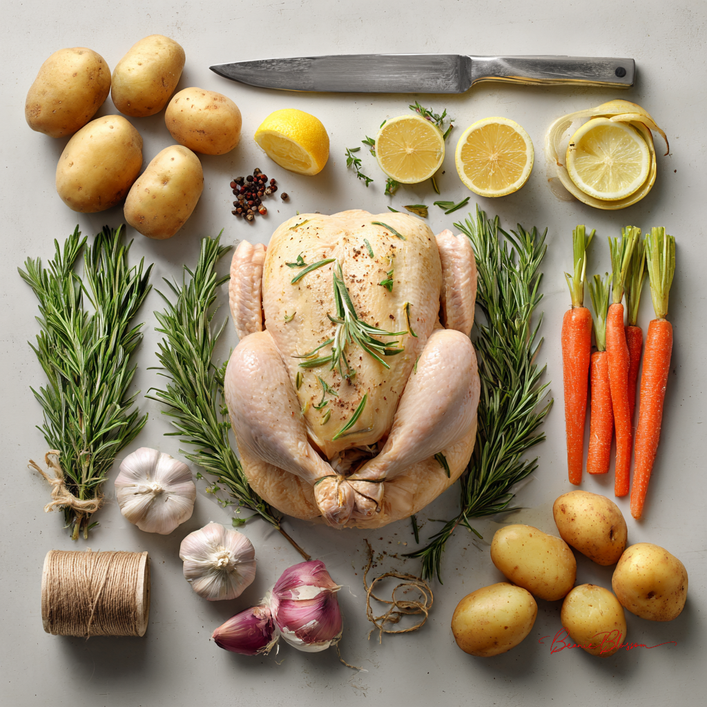 Knolling product photo of a delicious roast chicken surrounded by rosemary sprigs, lemon halves, garlic bulbs, carrots, potatoes, kitchen twine, and a carving knife arranged on a clean background.