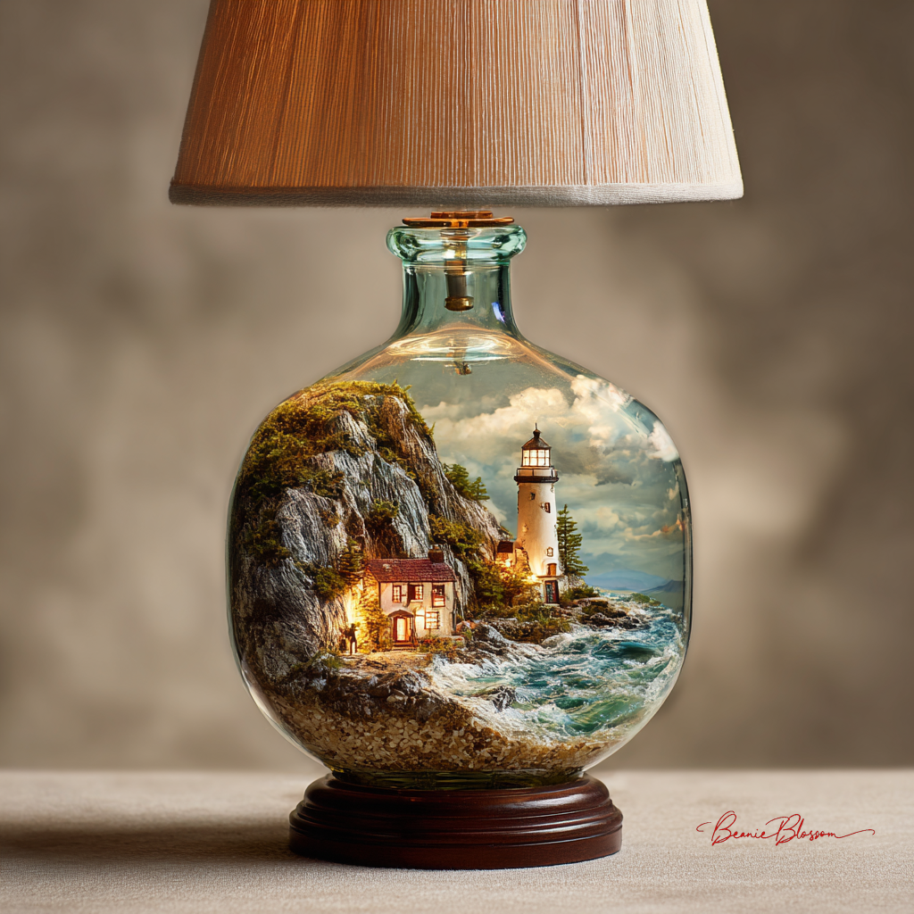 a table lamp with an oval glass bottle base containing miniature beachscape, such as cliffs and a lighthouse, creating a unique visual effect. the focus is on the face.