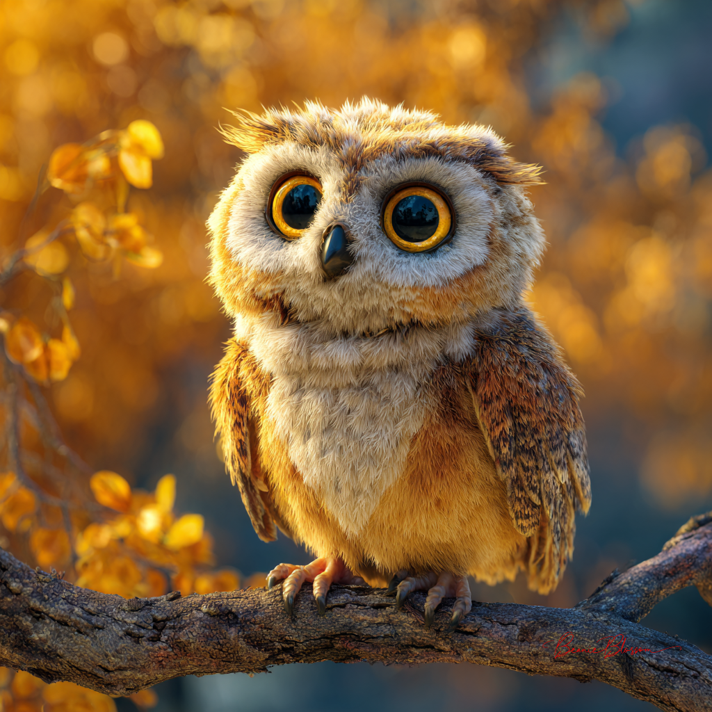 cute owl sitting on a tree branch in an autumn forest, with golden hour lighting. photorealistic 3d rendering of an adorable animal in a natural background. high-resolution photography style.