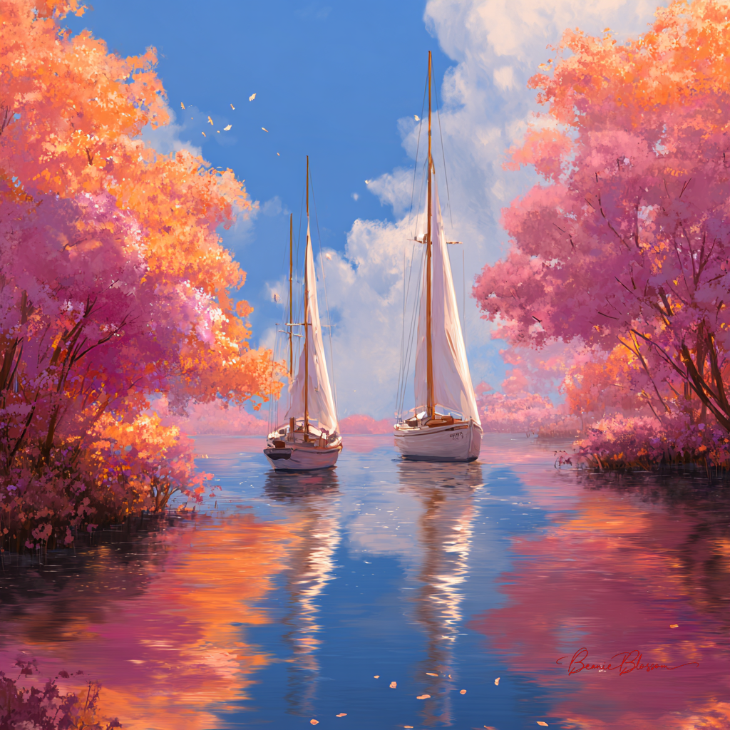 a digital art illustration of two sailboats on calm water, surrounded by trees with pink leaves and flowers in full bloom, reflecting the setting sun's golden light on their surfaces. the sky is clear blue with scattered clouds, creating an atmosphere reminiscent of autumnal beauty. this scene captures warm hues of orange and red against cool blues, evoking feelings of tranquility and romance.