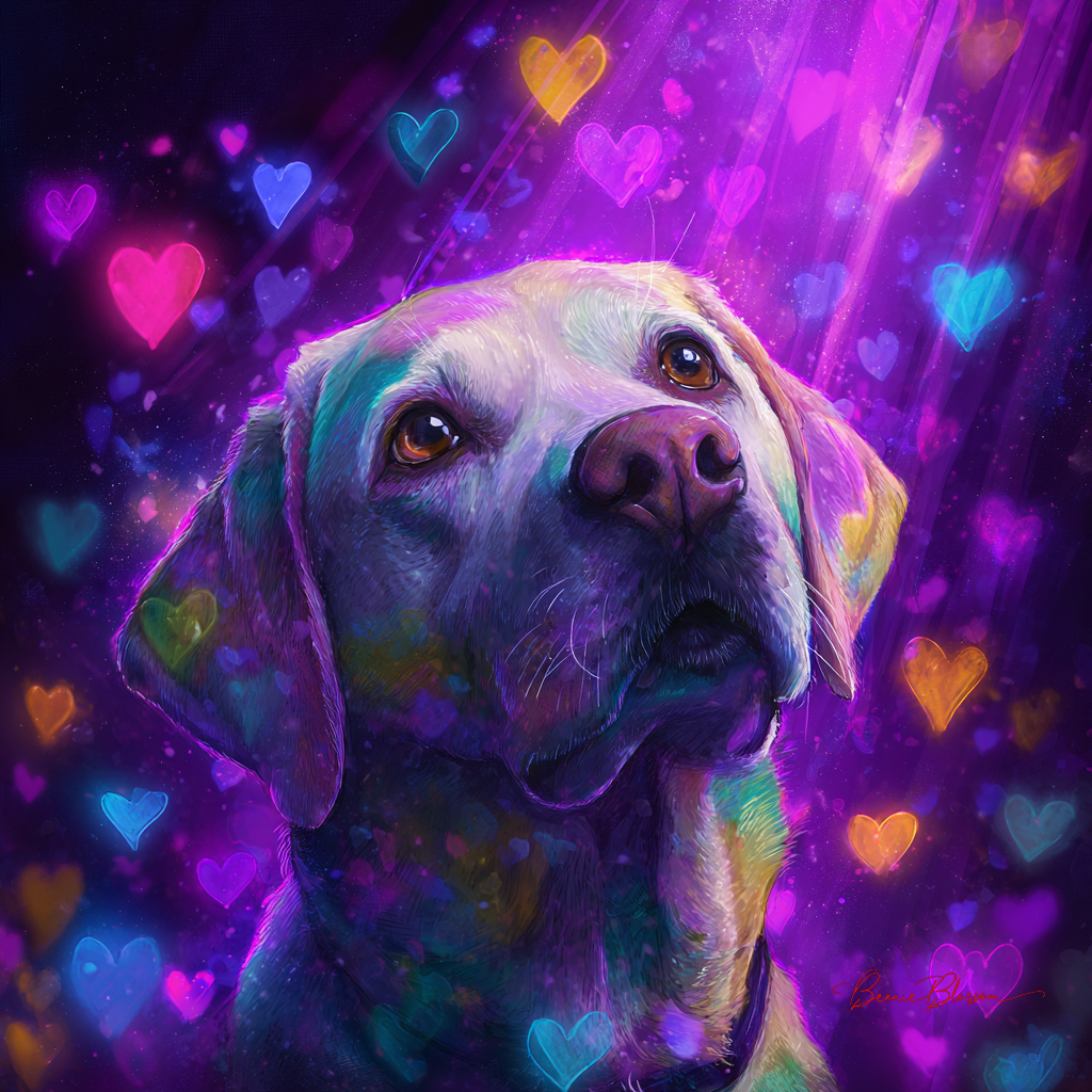 digital art of an adorable labrador retriever surrounded by colorful hearts, set against a vibrant purple background with light rays piercing through the darkness. the focus is on the dog's face.