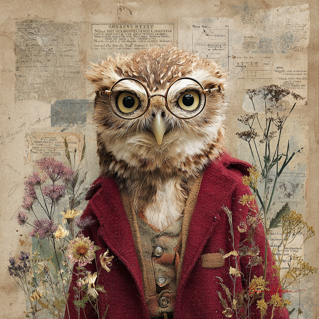 A whimsical mixed-media collage of a tiny librarian owl wearing wire-rimmed spectacles and a burgundy cardigan vest, Delicate watercolor washes blend with collaged vintage typography, dried pressed flowers, and snippets of antique maps, creating a dreamlike atmosphere of scholarly tranquility and gentle magic.