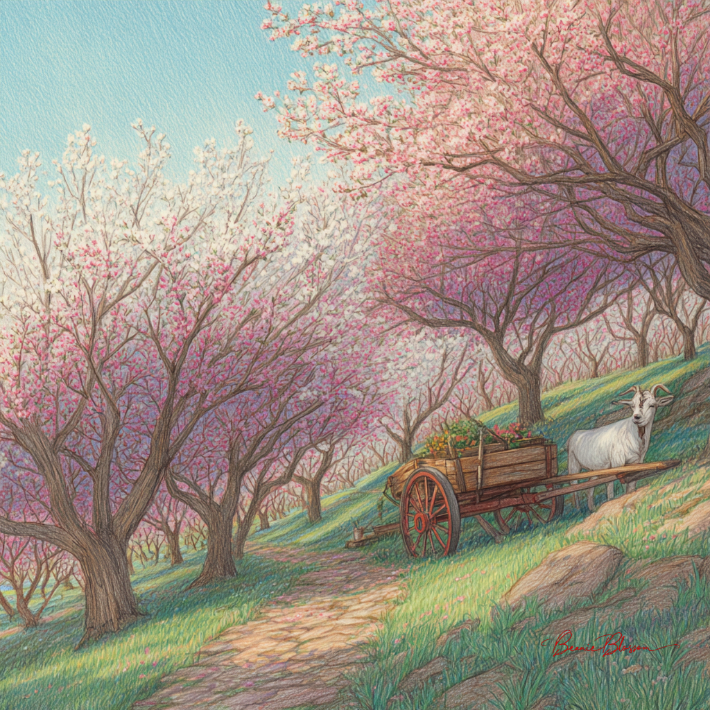 A small hillside orchard in early spring, where rows of blooming apple trees create soft pink canopies. A wooden cart filled with fresh blossoms sits on the path, a goat is grazing and a gentle breeze carries petals across the grass. Rendered in colored pencil style with light texture, soft gradients, and a cheerful, uplifting mood.