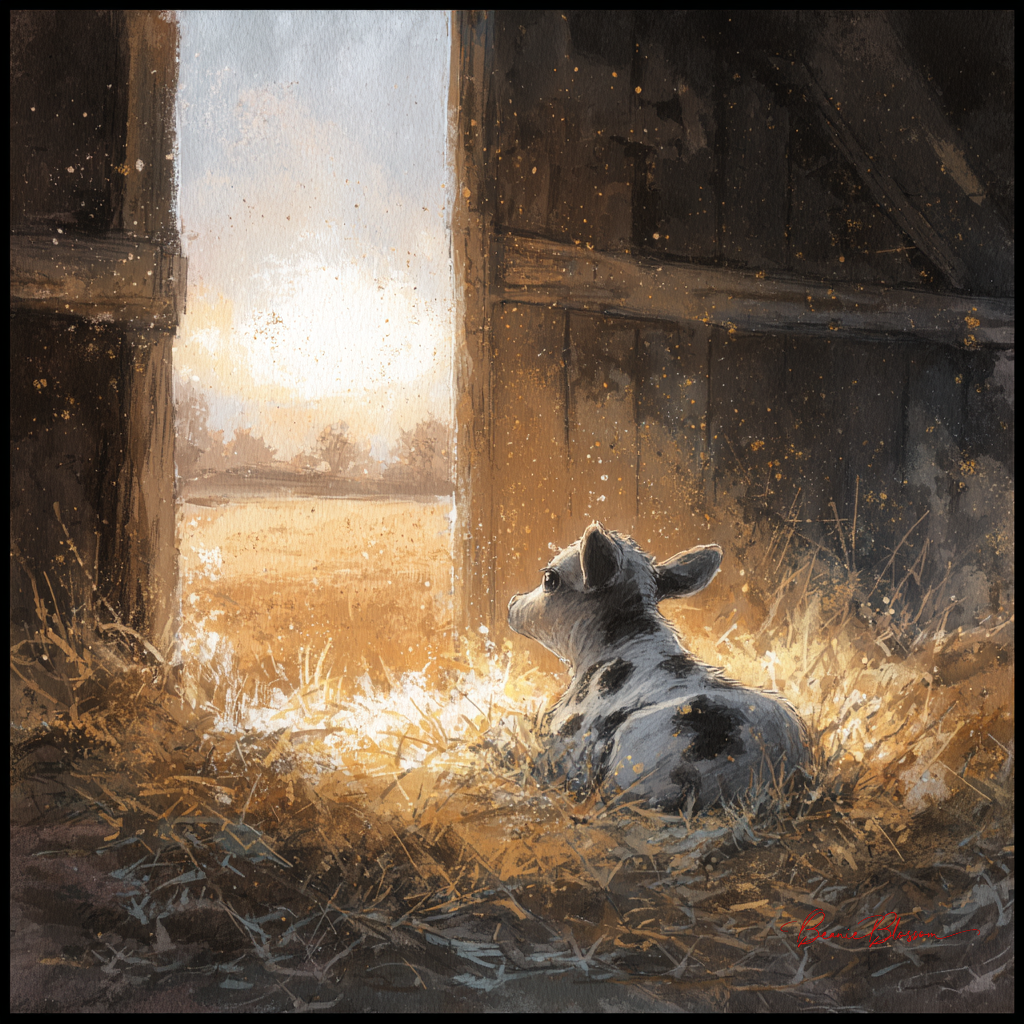 A little calf lying in a barn, watching the sunrise over the fields. Soft straw surrounds it, and dust particles shimmer in the warm morning light. Rendered in warm pastel illustration style with gentle textures and a comforting, peaceful mood.