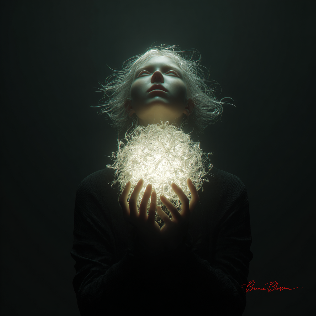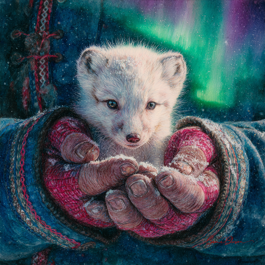 A pristine hyperrealistic watercolor portrait of a young Sami reindeer herder's weathered hands cupping a newborn arctic fox kit against the ethereal backdrop of the Aurora Borealis. The fox's impossibly soft white fur contrasts with the herder's traditional blue and red wool mittens, while delicate snowflakes settle on both the kit's tiny pink nose and the intricate silver threading of traditional Sami clothing visible at the edges of the frame. The Northern Lights paint the scene in otherworldly greens and purples, casting an ethereal glow across the herder's gentle expression of wonder and protection, with each individual whisker of the fox kit rendered in microscopic detail.