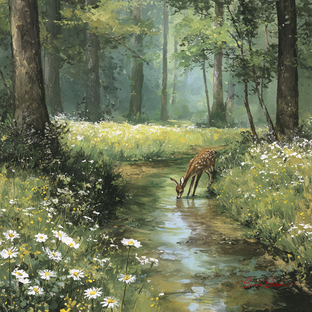 A gentle stream winds through a bright forest meadow, where a young deer pauses to drink. Sunlight filters through tall trees, casting soft patches of light across wildflowers. Rendered in gouache style with matte textures, warm greens, and a calm, heartwarming atmosphere.