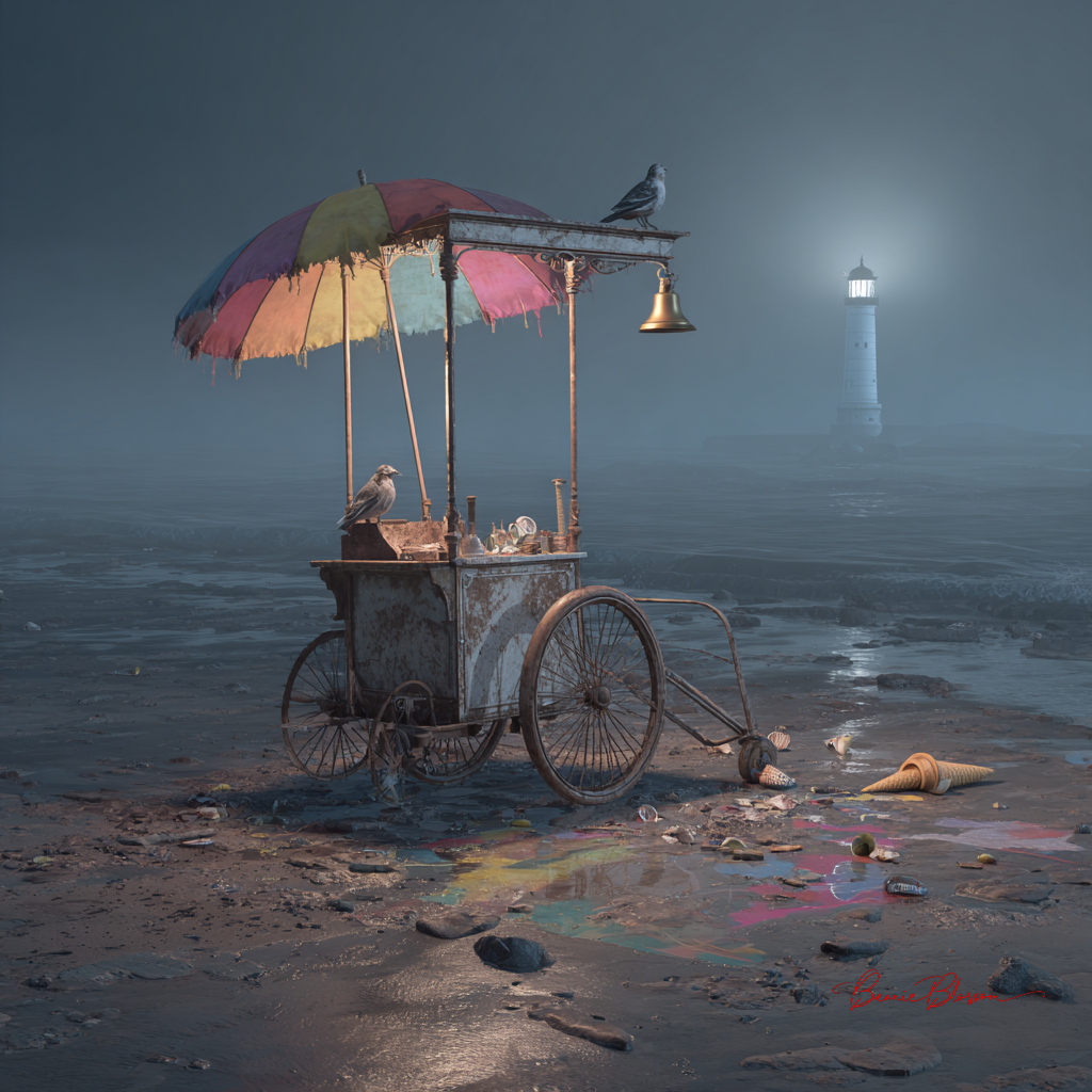 A solitary ice cream vendor's cart abandoned on a moonlit beach at low tide, the ornate Victorian-style cart tilted at a precarious angle with one wheel buried deep in wet sand, colorful umbrella torn and flapping in salt wind, melted rainbow puddles creating abstract patterns around scattered waffle cones, distant lighthouse beam cutting through fog, seagull perched on the cart's brass bell, waves retreating to reveal scattered shells and seaweed tangled around the cart's delicate wrought-iron wheels