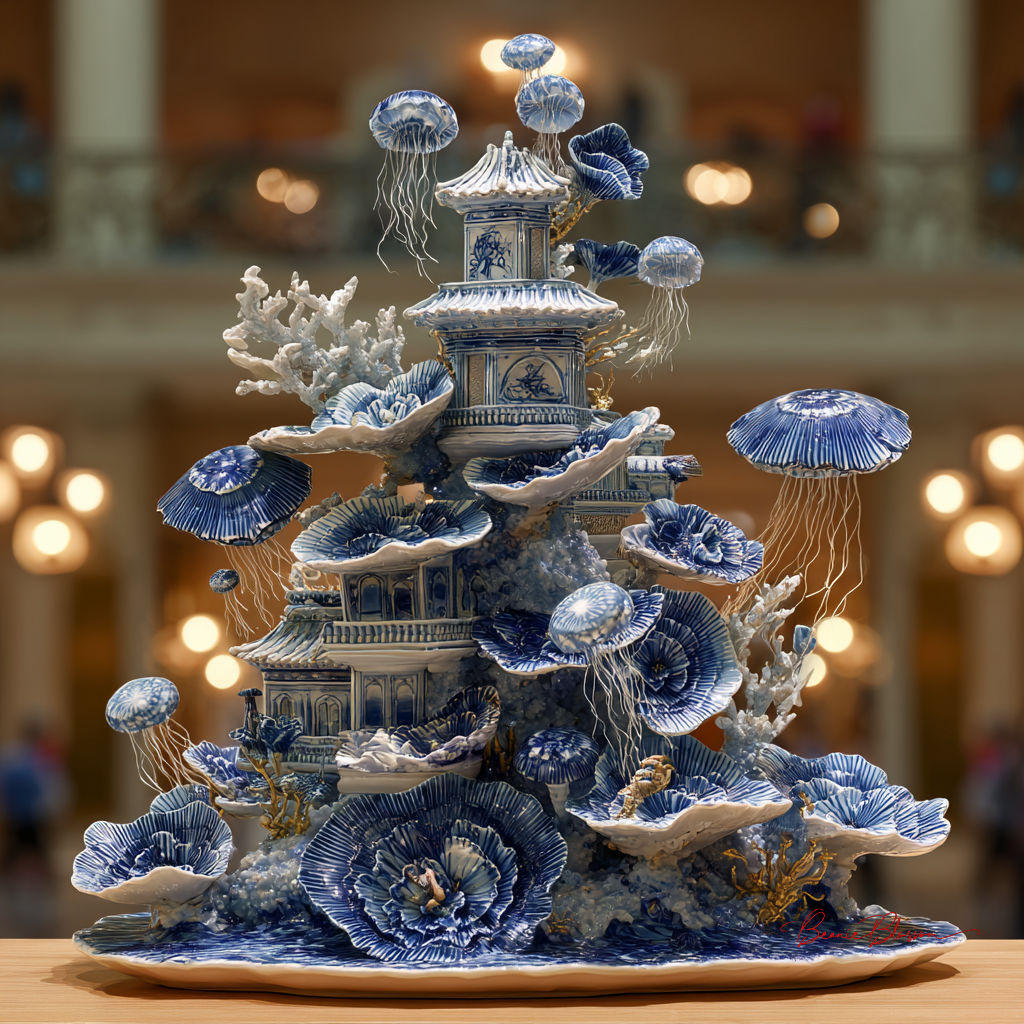 A hyper-detailed ceramic sculpture of a towering coral reef aquarium in the style of ancient Chinese porcelain, featuring delicate blue and white glazework depicting schools of translucent jellyfish floating through intricate coral formations, with tiny hand-painted sea dragons weaving between anemone towers, golden koi swimming in spirals around miniature underwater pagodas, and crystalline water effects created through layered transparent glazes that catch and refract light like actual seawater.