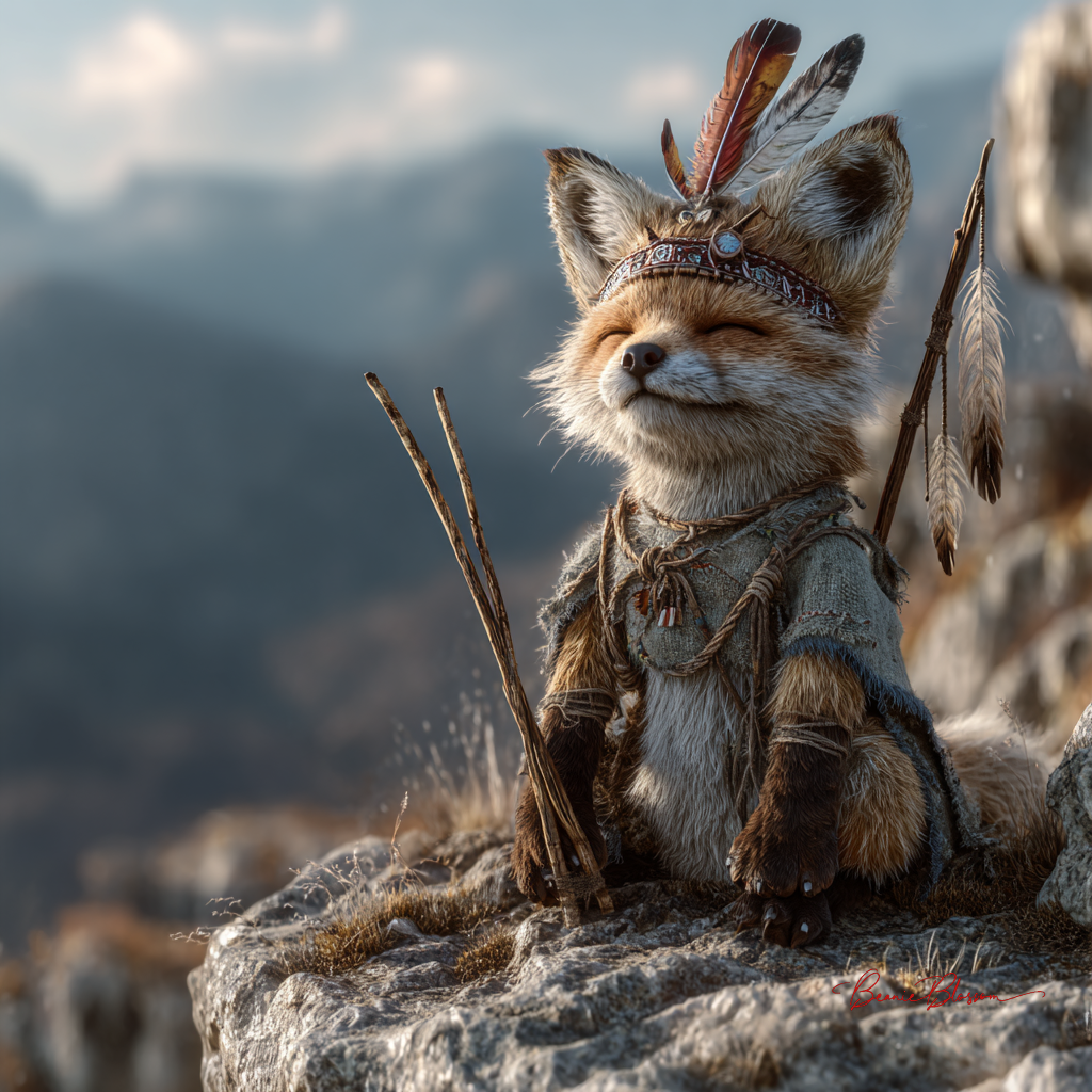 a cute happy fox cub dressed as a shaman, sitting on the edge of a cliff in a mountainous landscape, wearing a feathered headdress and traditional made from animal skins, holding wooden sticks, with a high-detail fur texture, in a photorealistic style.