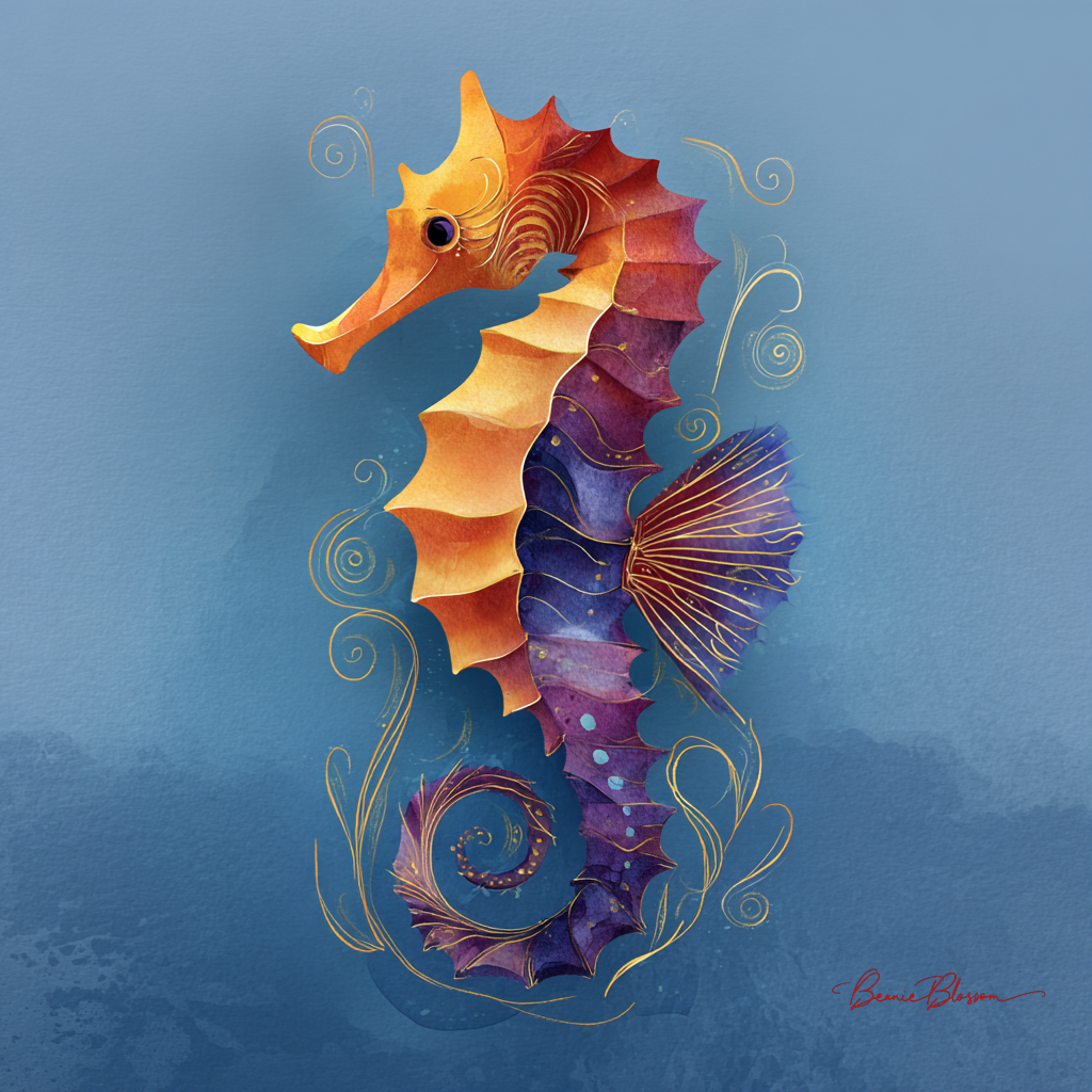 a colorful seahorse depicted in an abstract style with minimal detail against a blue gradient background. the illustration is created using digital painting techniques and includes elements like swirling watercolor textures for the shell and fluid lines to emphasize movement. this design emphasizes creativity while conveying beauty through its use of colors and shapes.