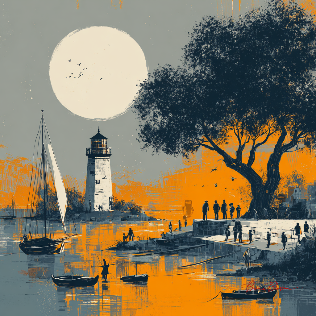 abstract drawing of a lighthouse and sailboat on a river, with a tree in the foreground, boats moored at the shoreline, and people walking along the embankment. a large, white sun shines above the horizon, creating a warm, digital art-style scene.