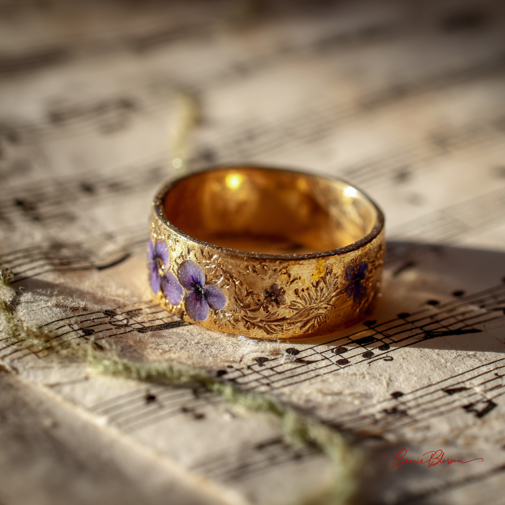 a single vintage golden ornate ring resting on a torn piece of handwritten sheet music, illuminated by soft afternoon sunlight The ring's surface shows decades of gentle wear, with tiny scratches and a warm patina that catches the golden light. Delicate purple violets have been pressed between the yellowed music pages, their translucent petals visible beneath the handwritten notes in faded brown ink. A single strand of emerald green embroidery thread curls around the ring's base, and microscopic dust motes dance in the warm light beam that creates a perfect spotlight on this forgotten corner.