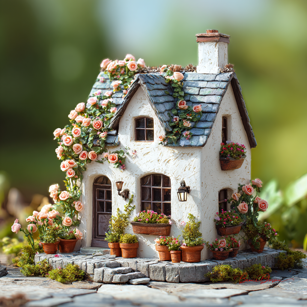 handmade white-painted clay house with roses on the roof,…