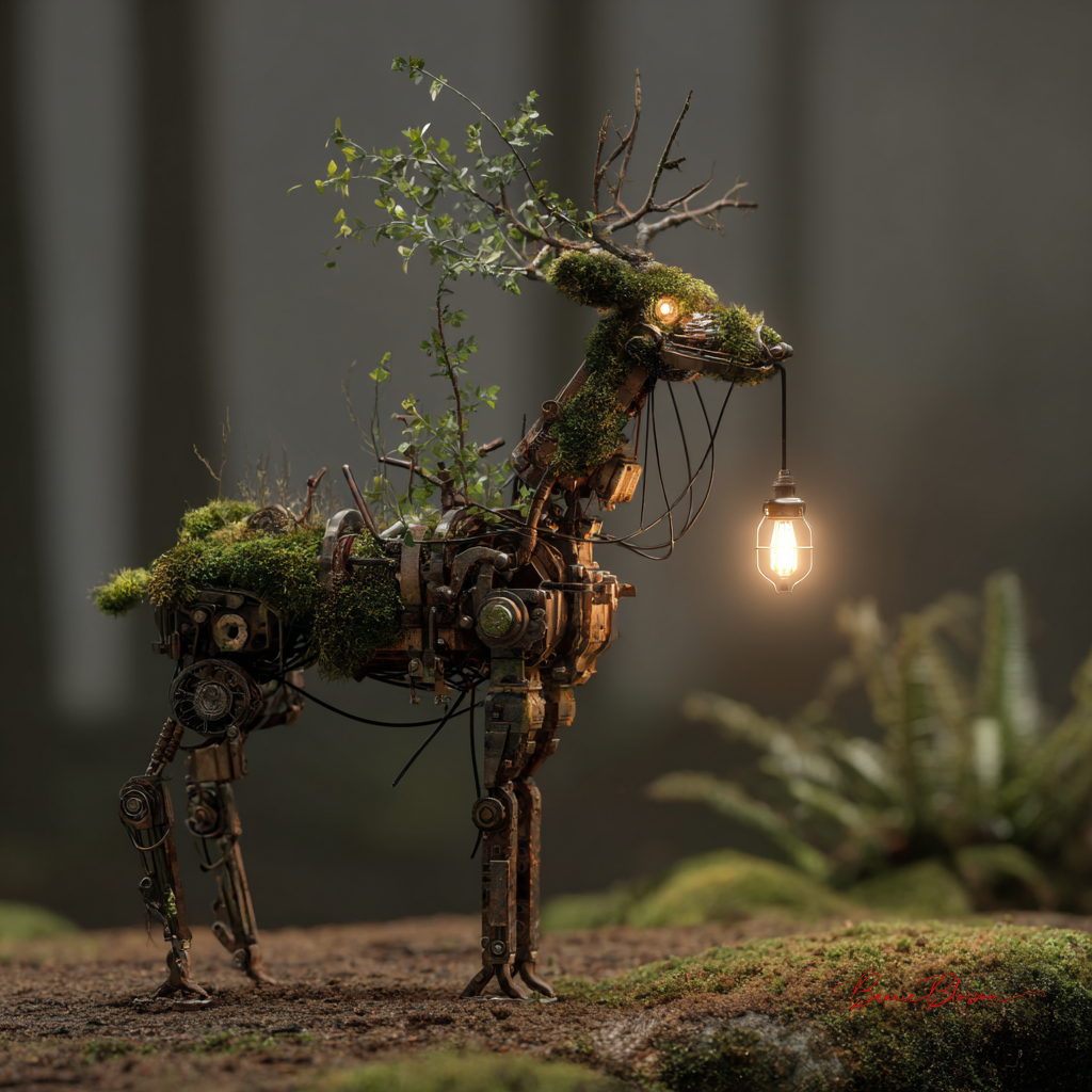a forest with moss, mist, and night lights. a mechanical deer made of old, broken parts stands on its hind legs in the woods. the head is covered by branches and leaves. it has an electric lamp hanging from its neck. in the style of a cinematic, photo-realistic scene.