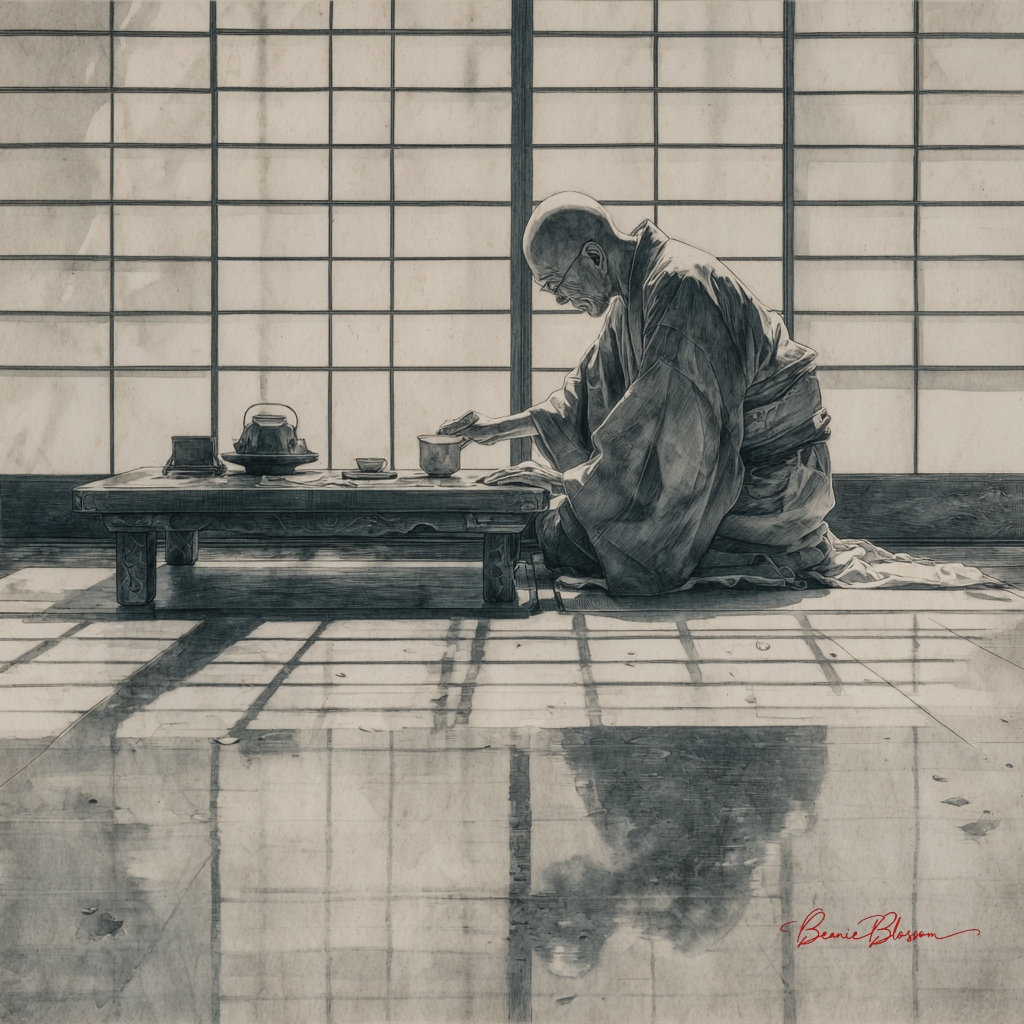 A hyper-detailed ink wash painting of a serene Japanese tea master in flowing indigo robes, kneeling gracefully beside a low bamboo table in a minimalist tatami room, delicate steam rising from a single ceramic teacup, soft morning light filtering through translucent shoji screens creating geometric shadows, cherry blossom petals scattered on the polished wooden floor, the master's weathered hands captured mid-gesture as they perform the ritualistic tea ceremony, every wrinkle in the fabric and grain in the bamboo rendered with meditative precision, evoking profound tranquility and mindful presence.