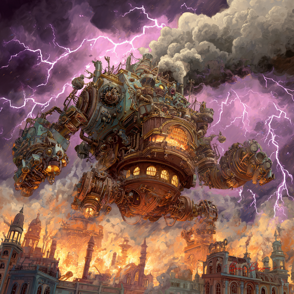 A hyper-detailed digital concept art piece of a colossal steampunk war machine erupting through storm clouds above a burning industrial cityscape, massive bronze gears and copper pipes belching torrents of green toxic steam, multiple articulated mechanical arms wielding crackling electrical weapons, the machine's hull adorned with intricate Victorian ironwork and glowing amber portholes, lightning splitting the apocalyptic sky in jagged purple streaks, the sprawling metropolis below consumed in orange flames and billowing black smoke, tiny silhouettes of fleeing civilians visible among the destroyed clocktower spires and factory smokestacks.