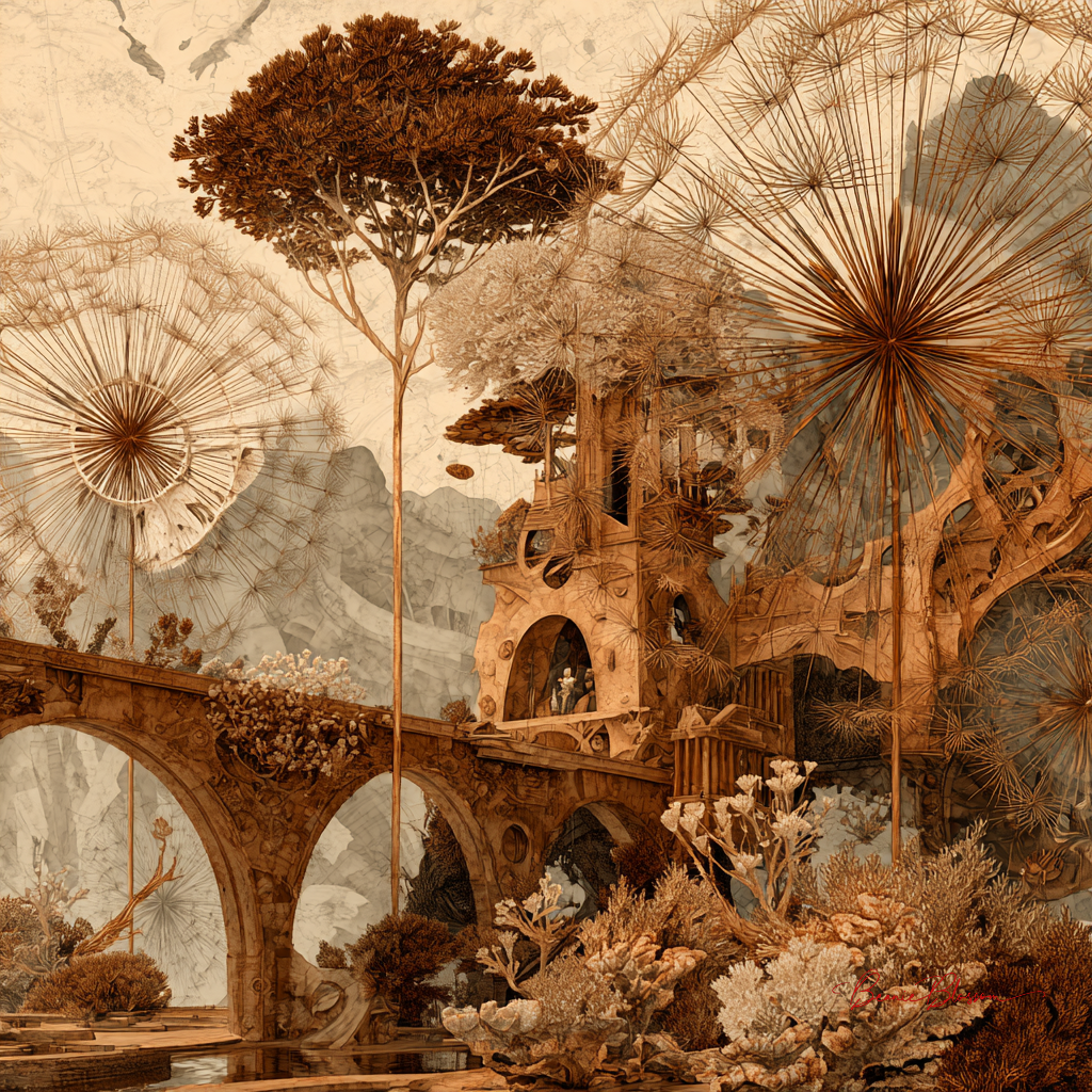 Create a stunning melancholic vintage botanical with hand-drawn scientific precision landscape with elements like enormous clockwork dandelions dispersing copper seeds across mirror-like desert dunes, petrified whale skeletons serving as natural bridges over rivers of liquid mercury, and colonies of bioluminescent coral growing from abandoned library towers. Make it look hauntingly delicate, sepia-toned, and precisely detailed with organic textures and warm copper patinas in the style of Impressionism.